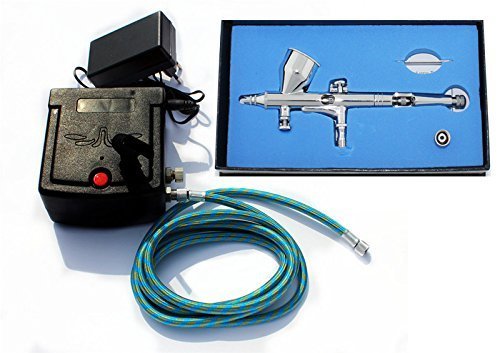PRODUCT DESCRIPTIONS:Features of Compressor: 1, Can start with pressure, and continuous work. 2, Suitable for dia 0.2-0.5mm air brush 3, It will turn off automatically when the power over heat and reset after the motor cool down. 4, The Power Light will turn red to green when the compressor start working. 5, One 6 Ft Air Hose with airproof rubber for connecting air compressor and air brush easily. Specification of Compressor: Air compressor: AC06 Voltage: 110-240V Frequency: 50-60HZ Color of compressor: Black Max Output/Min: 10L/min Current Input: 0.8A Max Pressure: 25psi/1.5bar Pressure adjustable Size: 136x102x66mm Specification of Airbrush Kit: Dual action Airbrush AB80 Paint transmission: Gravity feed 1. Nozzle Diameter: 0.25 mm 2. Fluid Cup Capacity: 9cc 3. Operating Pressure: 15-50 PSI 4. Switch Mode: Dual-Action Trigger Control 5. Paint Distance: 50 ~ 100mm 6. Length of Spray Pen: 5.67" / 14.4 cm 7. Color: Silver Spraying Procedure: 1. Connect the airbrush with air hose and air compressor. 2. Plug adatpor into power source and connect to air compressor. 3. Fill fluid in the cup after thinning appropriately. 4. Hold the airbrush lightly in your hand. 5. Turn on the compressor, adjust the pressure according to your experience. 6. By pressing the air/fluid control knob vertically, a stream of air emerges. Then draw it backward gradually for color atomization. 7. The spray pattern is in accordance with the distance between a work surface and a air brush. Package Included: 1x Mini Air Compressor 1x Airbrush Kit 1x Airbrush Holder 1x AC Transformer 1x Air Hose 1x Manual