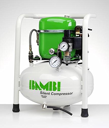 PRODUCT DESCRIPTIONS:This compressor has piston rings. This means oil carry over can be experienced. This compressor has a 50% duty cycle. This means 10 minutes on, 10 minutes off. Up to a maximum of 30 minutes on, 30 minutes off. Not intended for heavy duty use. Should not be used with air tools. Capacity: 50 Litres/min; Drive: Direct; Motor: 0.5 HP (0.34 Kw); Pressure: 8 Bar; Receiver: 15 Litres; Voltage: 240 or 110 Volts; Flow @ 4 Bar: 35 Litres / Min; Dimensions: 61 x 50 x 30 mm (H x W x D); Noise Level (dBA): 40 dB(A) Designed to require minimal maintenance and to ensure years of trouble free use, the Budget Range meets the needs of many applications including; air-brushing, exhibition stands, glue dispensing, pneumatic controls, stapling.... and more. Expectional value for money! The BAMBI Budget Range has been developed for those users where ultra low noise and relatively small flow of air is required. With sound levels from just 40 dB(A) (the same as the hummmm of a fridge) and almost no vibration when running, Bambi Budget Silent Air Compressors can be located in the work or home area without causing any noise intrusion. BAMBI is a UK company established for over 30 years. Finally, because they are built by Bambi, quality, ease of use and reliability come as standard on every model. A comprehensive warranty extending to 3 years on the air receiver ensures peace of mind which combined with the Bambi after sales care package guarantees you have made the right choice by choosing Bambi.