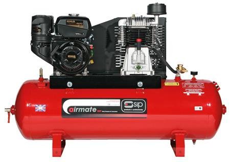 PRODUCT DESCRIPTIONS:Reliable petrol powered compressors - ideal for industrial use. Built in the UK by SIP these compressors are powered by Kohler® industrial petrol engines. All Kohler engines are fitted with Quad Clean heavy duty cyclonic air cleaner - cyclonic motion forces large particles of contaminants out of the engine. A static compressor, for permanent installation, but a wheel kit is available as an option. Recoil start option available - see 04334Powerful Kohler® 9.5hp petrol engine23 CFM (678 litres/min) piston displacement200 litre air receiverEngine designed in the USABritish made air receiver exceeds CE regulationsLarge finned cylinder head for optimal heat dissipationSafety valve for worry free operationAutomatic unloader valveBuilt and Tested by SIP in the UK3 year parts, 10 year air receiver anti-corrosion warranty